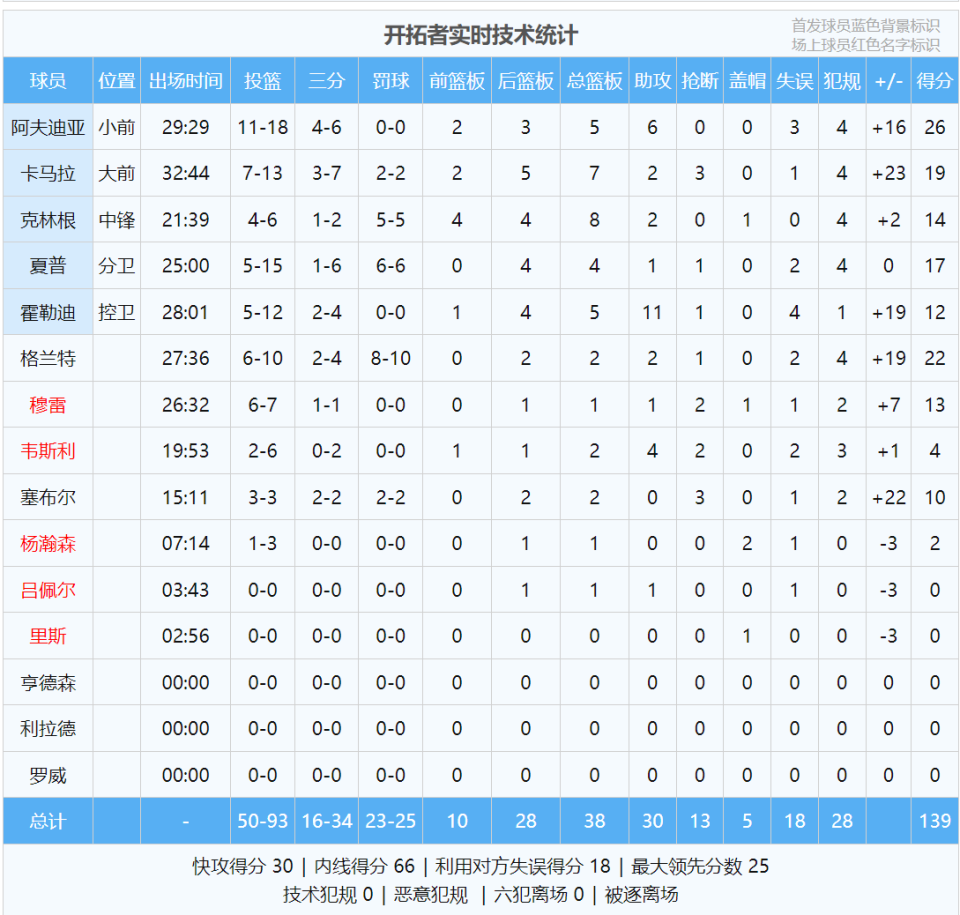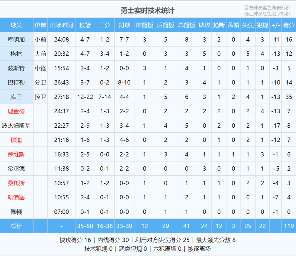 库里空砍35分6板3助2帽、库明加16分8板3助2断、巴特勒14分3板4助!开拓者多点开花:阿夫迪亚26分5板6助、格兰特22分、卡马拉19分7板3断、夏普17分4板、克林根14分8板。最后看看数据,说说你的心情: